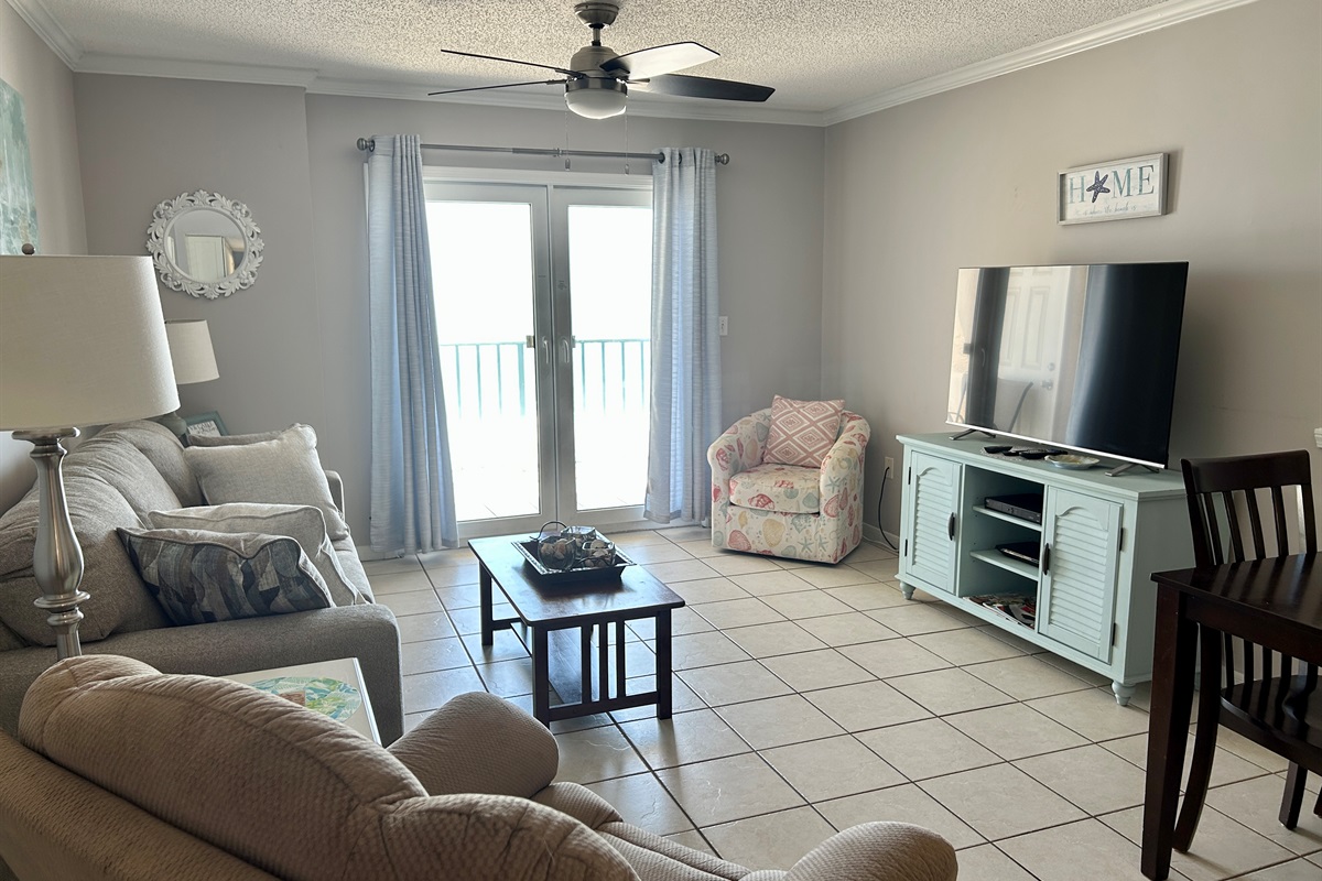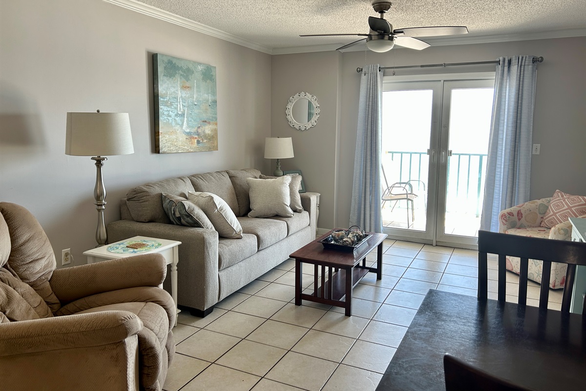 The beach is just a few steps away! This non-smoking, 5th floor beachfront unit is located in Gulf Shores. It comfortably sleeps 6 and features approximately 800 sq ft of living space. The master bedroom has direct balcony access, a King bed and full bath. The guest bedroom features a queen bed, twin bunks and a private bath. There is also a sofa bed in the living room. Enjoy a direct view of the beach and pool on the 8' x 20' covered balcony. Just one mile from The Hangout, this unit is centrally located to restaurants and shops.